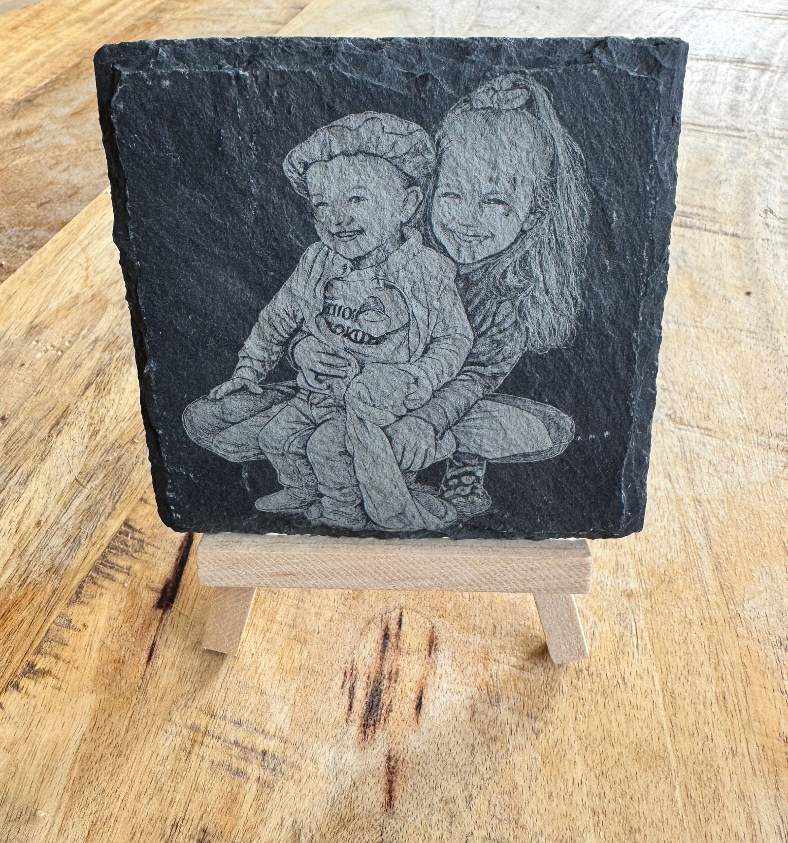 Laat nu je favoriete foto laseren op leisteen. Beschikbaar met of zonder houder.