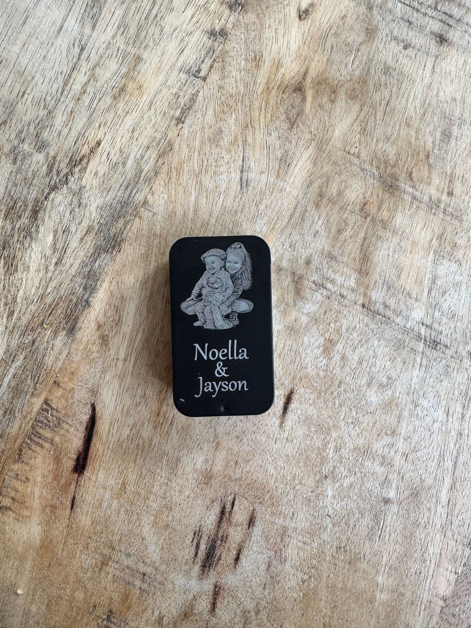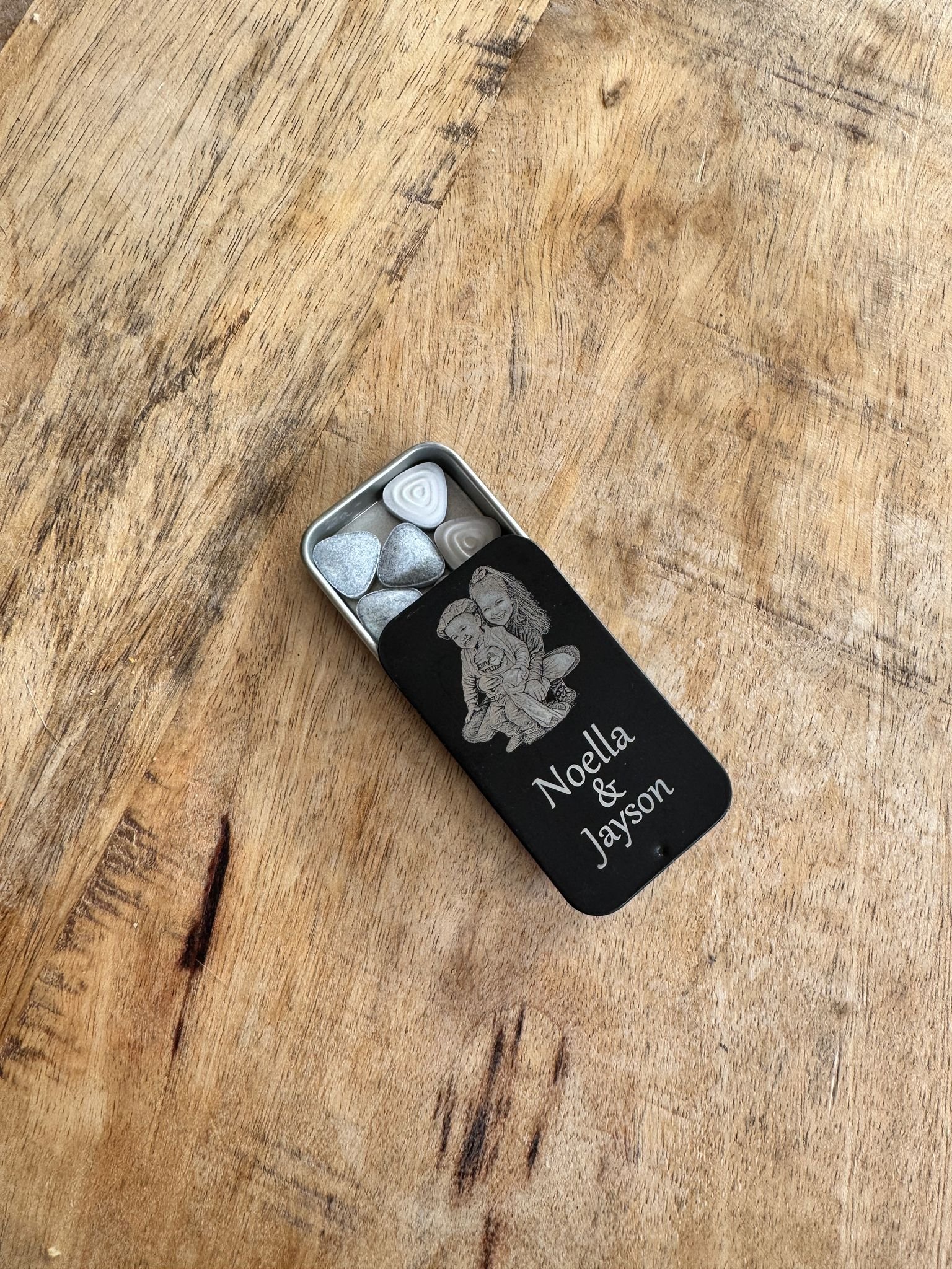 Metalen doosje met schuifdeksel voor kleine snoepjes met foto of tekst. Leuk om als aandenken aan gasten mee te geven.